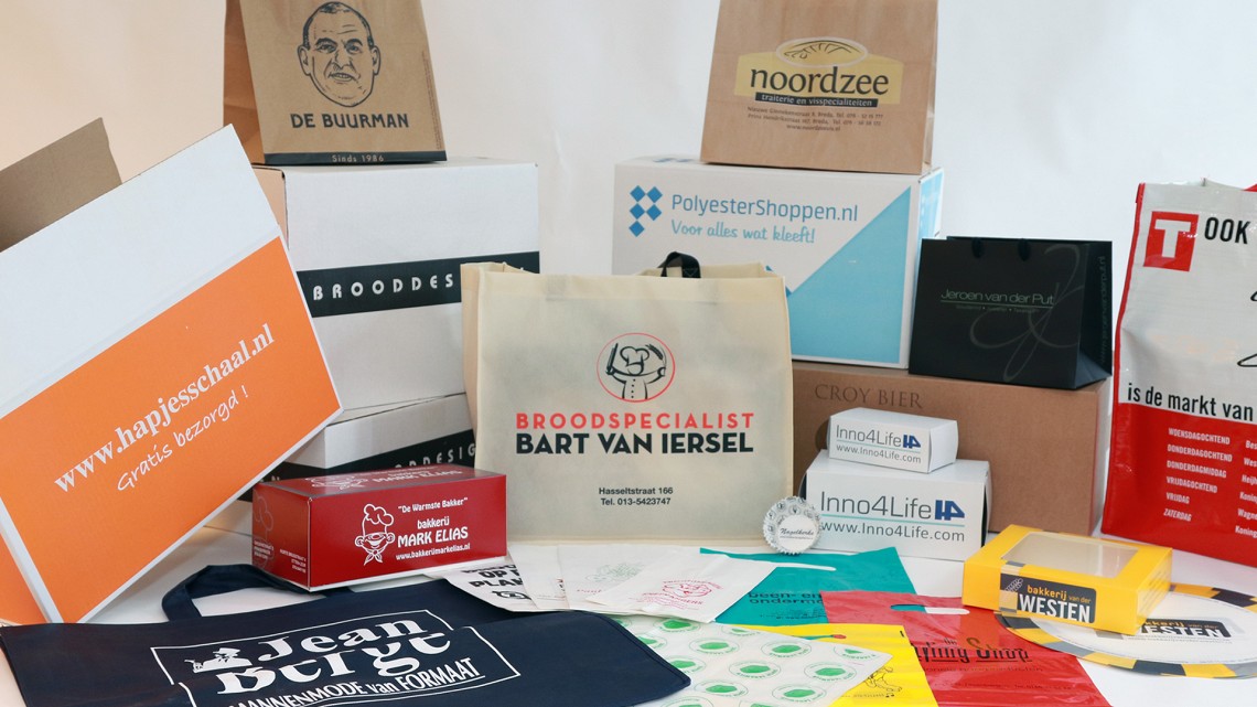 - Plastic of bio-afbreekbare tasjes: Handig voor winkels en beurzen, bedrukt met bedrijfsnaam of campagne-uiting.